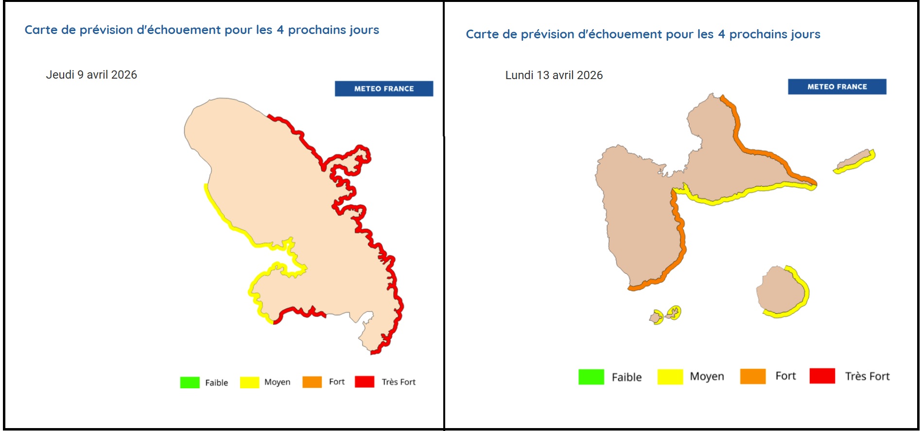 Dans l’archipel de la Guadeloupe, les arrivages viennent de l’est, précise Météo France dans un bulletin du 13 avril. L’agence prévoit des arrivages. « L’océan Atlantique reste très chargé en algues sargasses, précise-t-elle. Une accentuation des échouements reste à prévoir dans les prochaines semaines. »